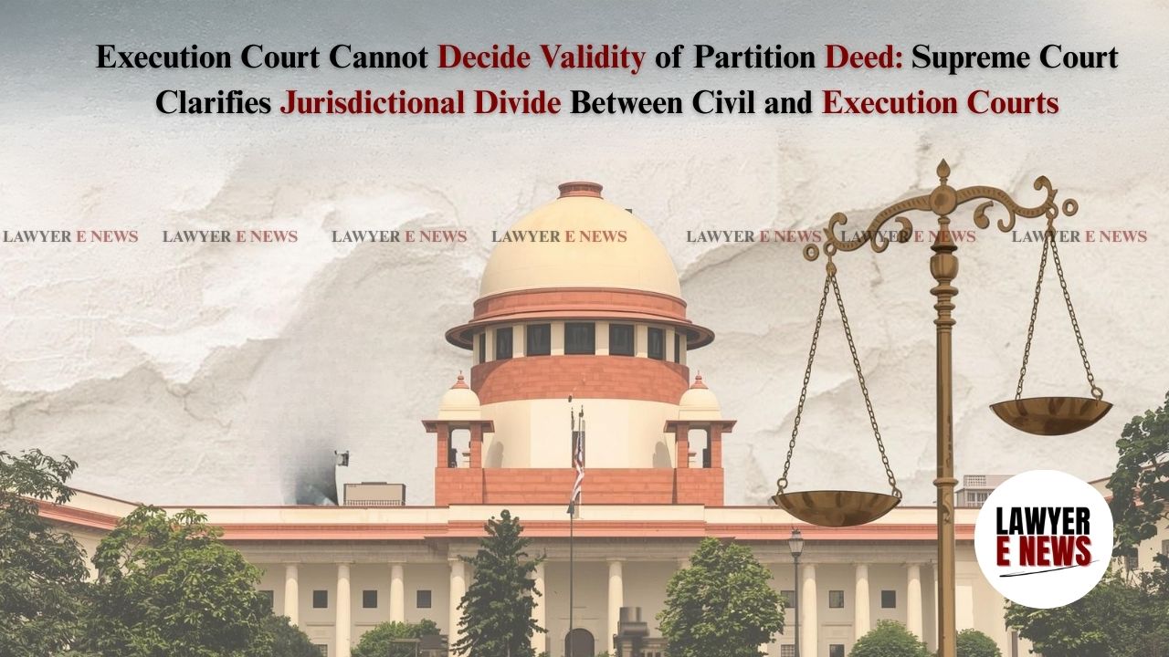 “Whether the KBPP is a valid partition deed or a family arrangement is a question for the Civil Court, not the Executing Court” – In a significant clarification of procedural law, the Supreme Court of India has drawn a firm line between the jurisdiction of Civil Courts and Execution Courts, particularly in matters involving challenge to the validity of family arrangements and alleged conciliation awards. The judgment reiterates that Execution Courts are not competent to adjudicate complex questions concerning coercion, fraud, or the validity of agreements such as a partition deed.
